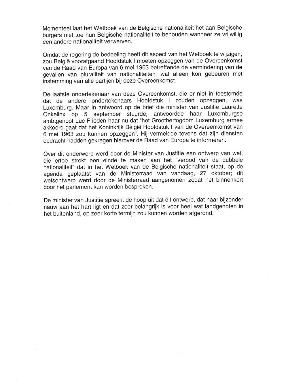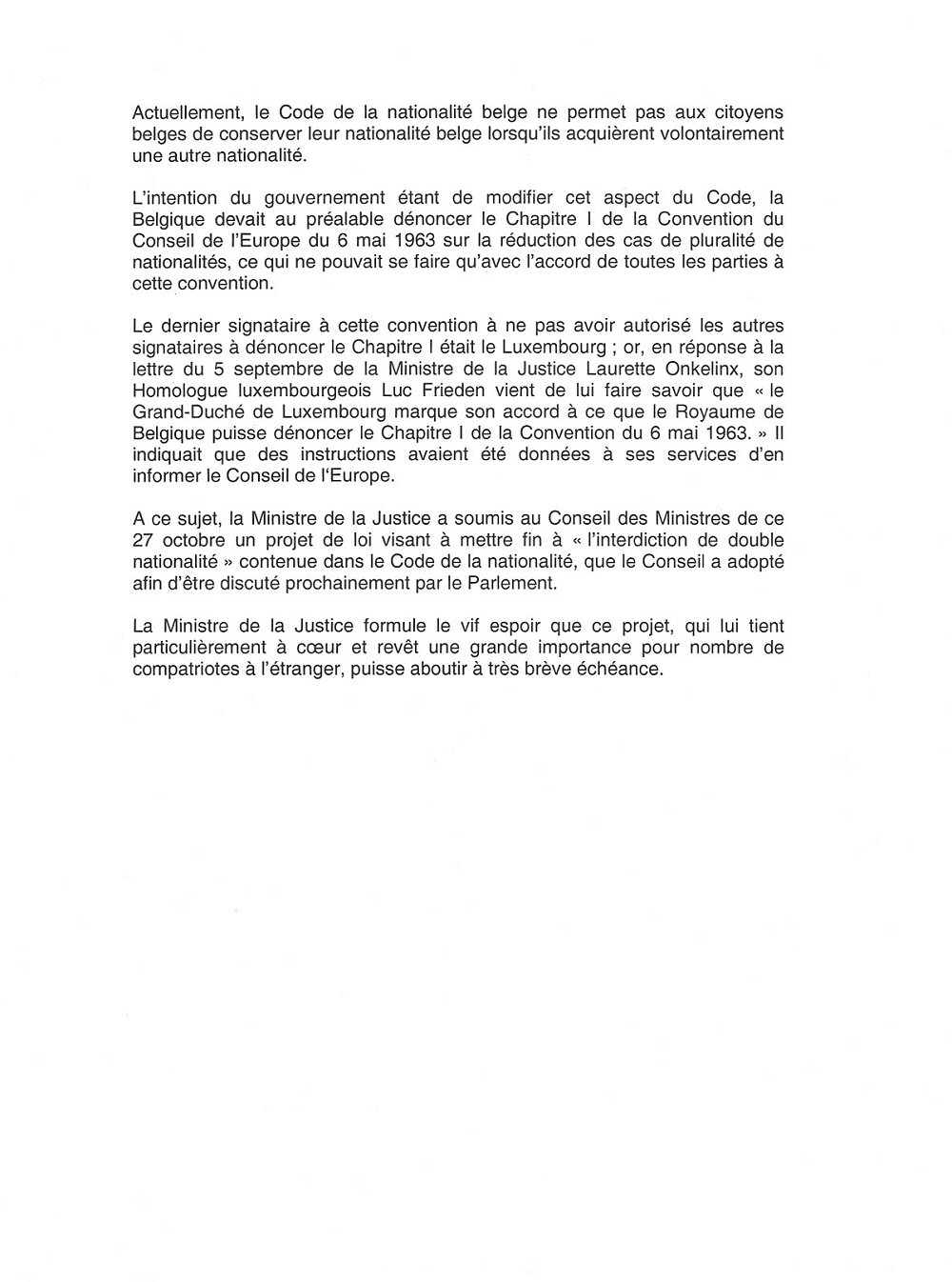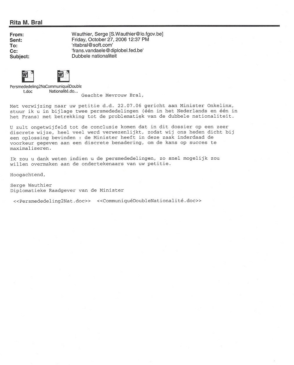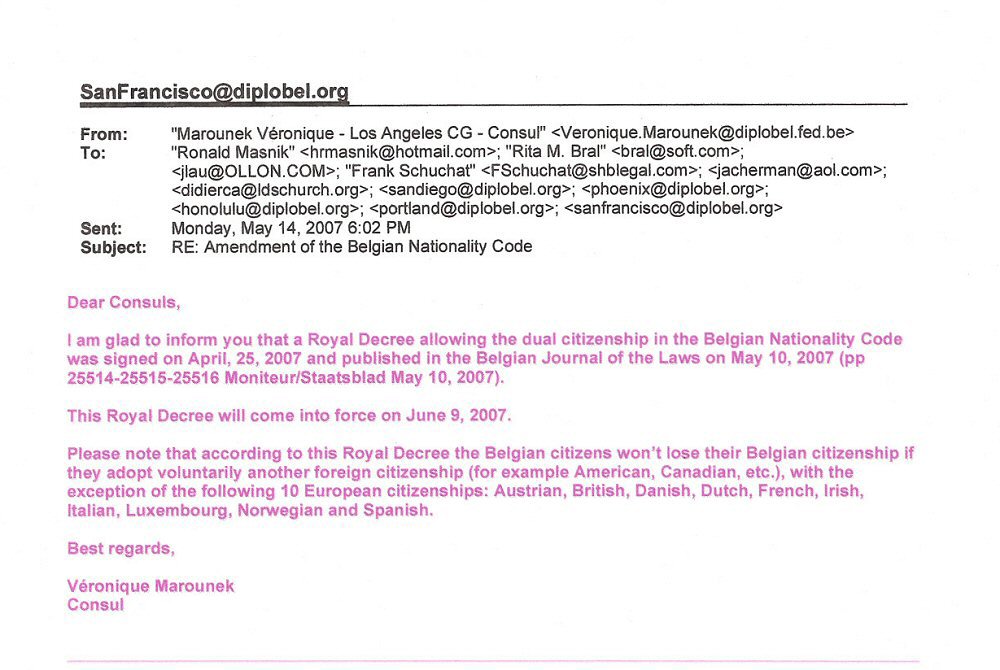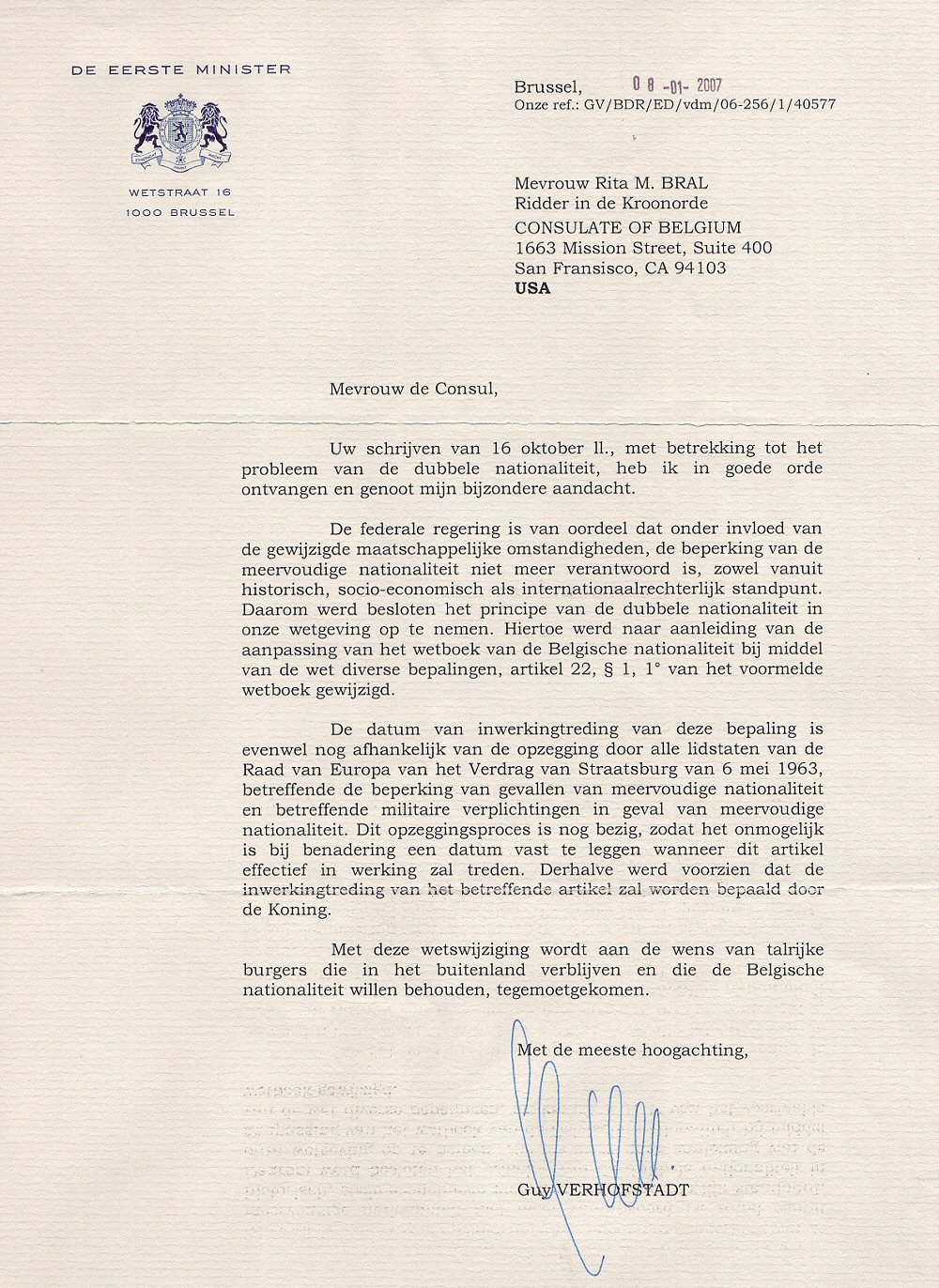 After ultimately collecting over 1000 endorsements to the idea, the regulations were changed in January 2007. See the Possessing Several Nationalities page on the Belgian Government website. Below are some of the key documents produced in this campaign. Taking advantage of a regulation she had been involved establishing, Rita became a citizen of the United States of America on 3 Septembeer 2013; she retains her Belgian citizenship. |