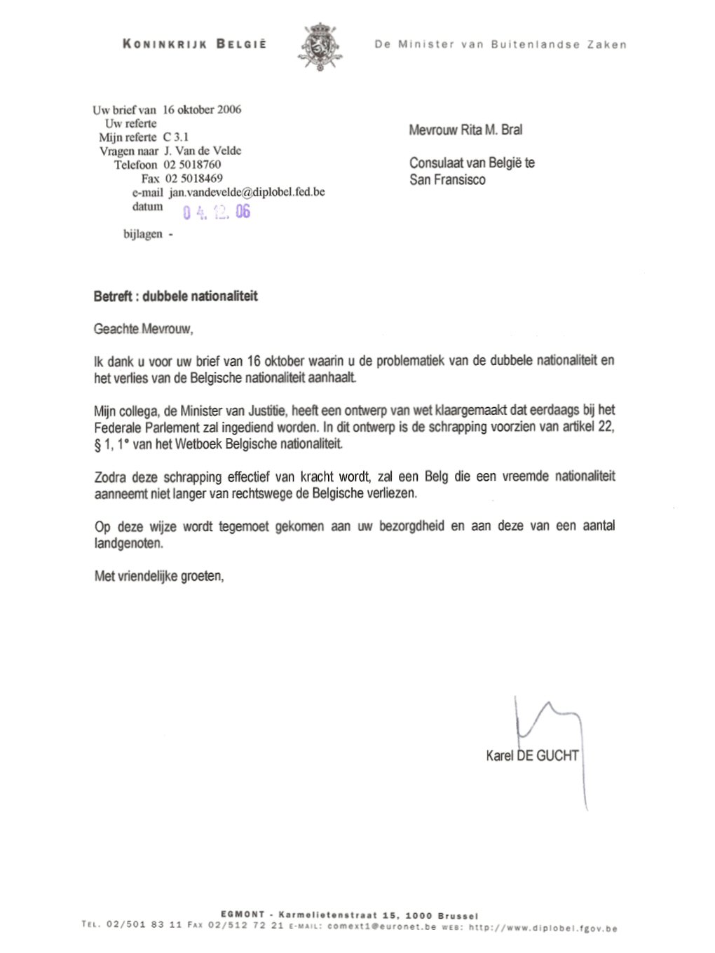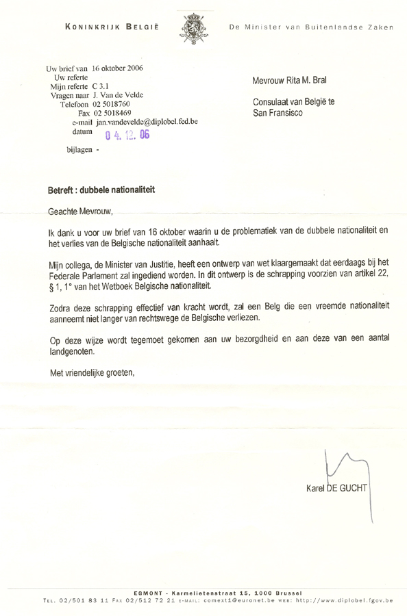 4 December 2006: Dual Citizenship Progress Letter from Karel DE GUCHT